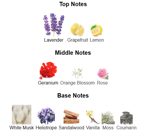 처음에는 상쾌한 라벤더와 시트러스의 청량감을 더하며 시작됩니다. 이어서 제라늄과 로즈가 은은하게 올라오며 따뜻하고 우아한 플로럴 향을 더합니다. 마지막에는 샌들우드와 머스크 그리고 바닐라가 깊이 있는 잔향을 남기며 온화한 분위기를 연출하죠.