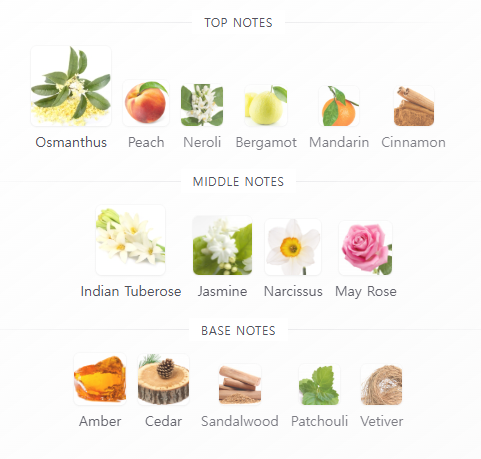 - 계열: 플로럴 / 화이트 플로럴 / 프루티 / 우디